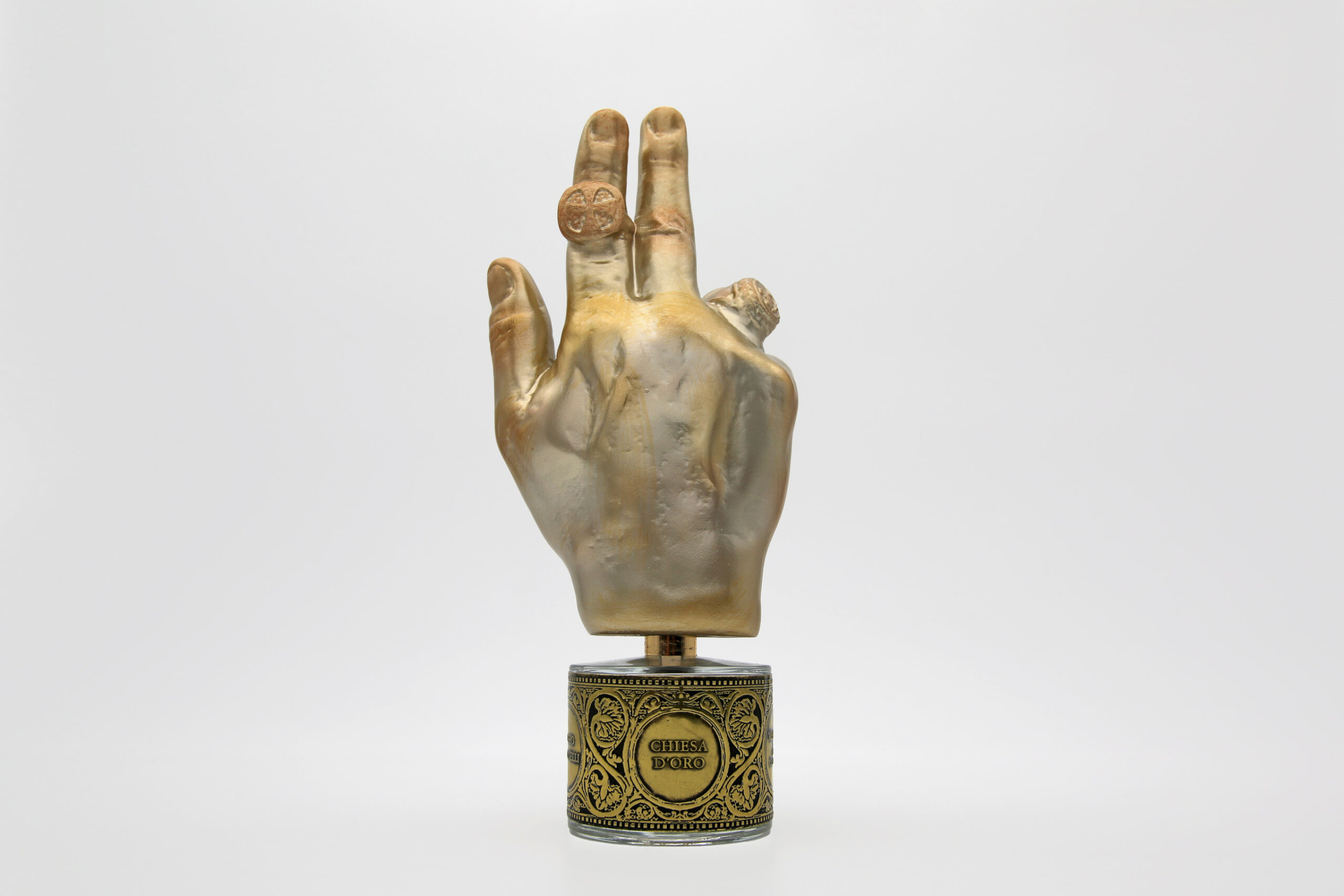Флаконы объемом 100 мл украшены тиснеными металлическими этикетками, вдохновение для которых Филиппо нашел в старинных узорах церквей. Стопперы флаконов имеют форму больших ладоней с массивными кольцами, которые сложены в жесте католического благословения. Слепок ладони сделан с руки Филиппо, дизайн колец разработан им же.